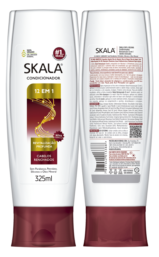 A linha Skala 12 em 1, enriquecida com vitamina E e D’Panthenol, possui uma restauração espetacular e nutrientes vitais com propriedades que agem diretamente nos fios para combater os principais sinais de danos: ressecamento, pontas duplas, opacidade, quebra, aspereza, desidratação, porosidade e perda de vitalidade. Transforme seus cabelos!