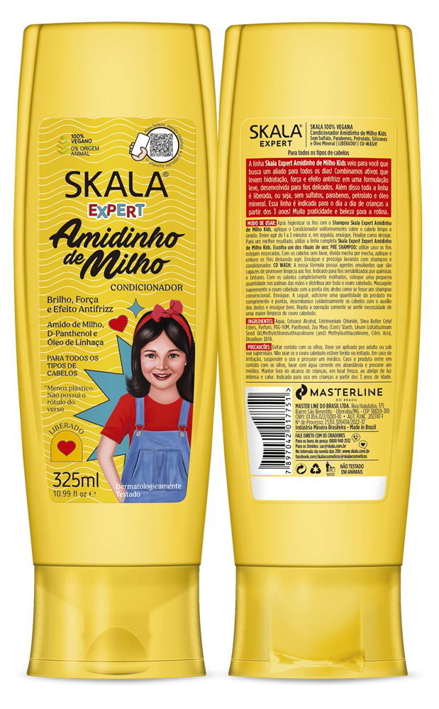 A linha Skala Expert Amidinho de Milho Kids veio para você que busca um aliado para todos os dias! Combinamos ativos que levam hidratação, força e efeito antifrizz em uma formulação leve, desenvolvida para fios delicados. Além disso toda a linha é liberada, ou seja, sem sulfatos, parabenos, petrolato e óleo mineral. Essa linha é indicada para o dia a dia de crianças a partir dos 3 anos! Muita praticidade e beleza para a rotina.