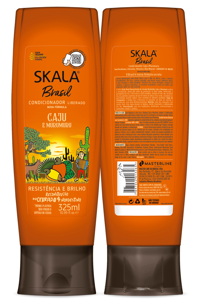 A Linha Skala Brasil Reconstrução do Cerrado Nordestino Caju e Murumuru acelera a reconstrução, dando alto poder de penetração na fibra capilar diminuindo a porosidade dos fios. O Murumuru é 100% brasileiro, extraído do óleo das sementes de uma palmeira espinhosa de até 10 metros de altura. Fruto verde, amarelado ou avermelhado quando maduro. Uma manteiga de altíssima qualidade.