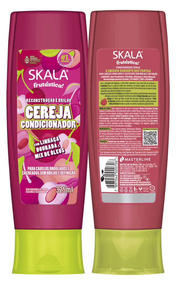 MODO DE USAR: Após higienizar os fios com o shampoo Skala Frutástica Cereja, aplique o condicionador uniformemente sobre o cabelo limpo e úmido. Deixe agir de 1 a 3 minutos e, em seguida, enxágue. Finalize como desejar. Para um melhor resultado, utilize a linha completa Skala Frutástica Cereja. Também pode ser utilizado como Pré-shampoo e Co-wash. Para Pré-shampoo, aplique nos cabelos secos, enluvando e deixando agir, antes de lavar com shampoo e condicionador da linha. Para Co-wash, aplique no couro cabeludo úmido, massageie e enxágue. Em seguida, aplique no comprimento e pontas, desembarace e enxágue.
